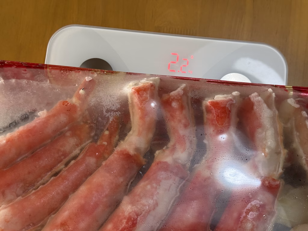 今回のタラバガニは、見た目のインパクトはもちろん、「家族3人でお腹いっぱい食べたい」時にぴったりのボリューム感。「総重量2.1kgってどれくらい?」という方は、このあと写真と実測値も交えて詳しくご紹介します。