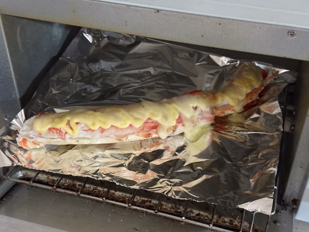 4本あった極太の脚のうち、1本を贅沢に使ってアレンジに挑戦! イメージしたのは、結婚式などで出てくる「伊勢海老のマヨネーズ焼き」です。 9Lサイズのタラバガニなら、あのプリプリ感を再現できるのでは?と思い、トースターで焼いてみました。