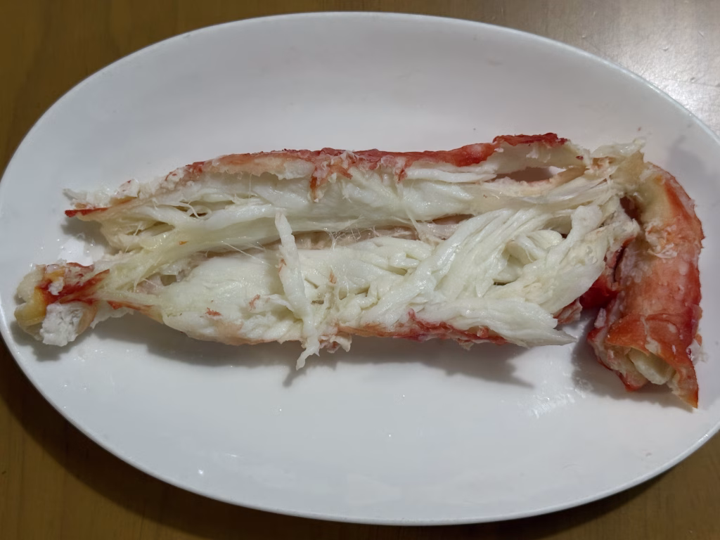 まず最初に手を伸ばしたのは、やっぱり一番立派な「太脚」の部分。 説明書にあった「お湯解凍」のおかげで、ほんのりと温かい状態。 まずは何もつけず、素材の味をダイレクトに味わってみることにしました。
